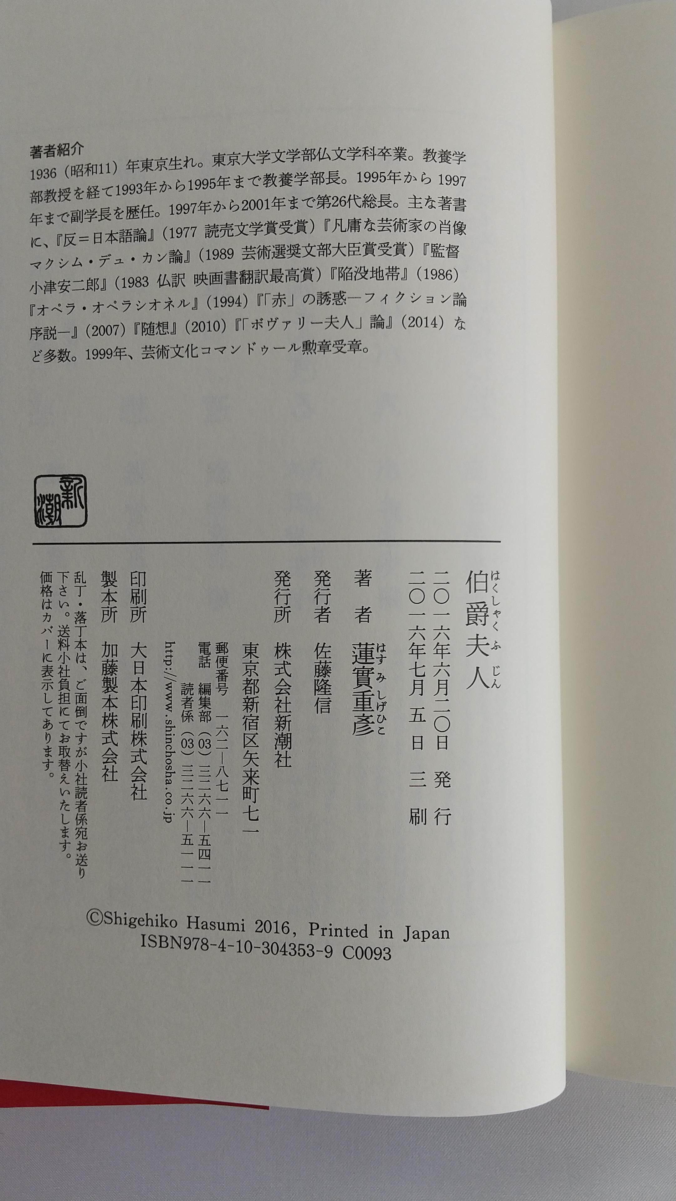 【良好・2016年第3版】『伯爵夫人』蓮見重彦|三島由紀夫賞受賞作・幻想文学|新潮社|古本・良好